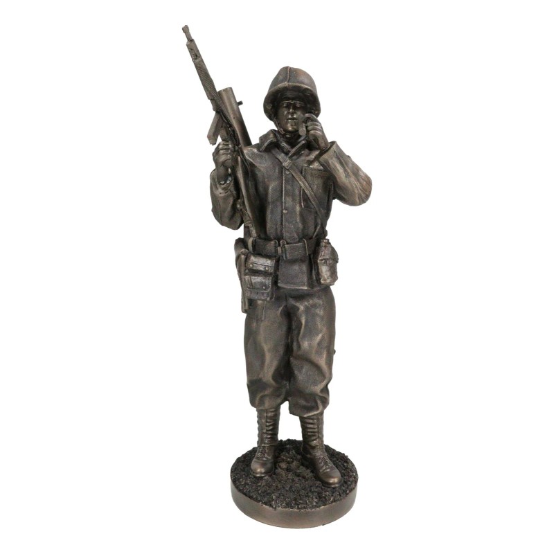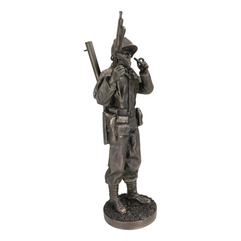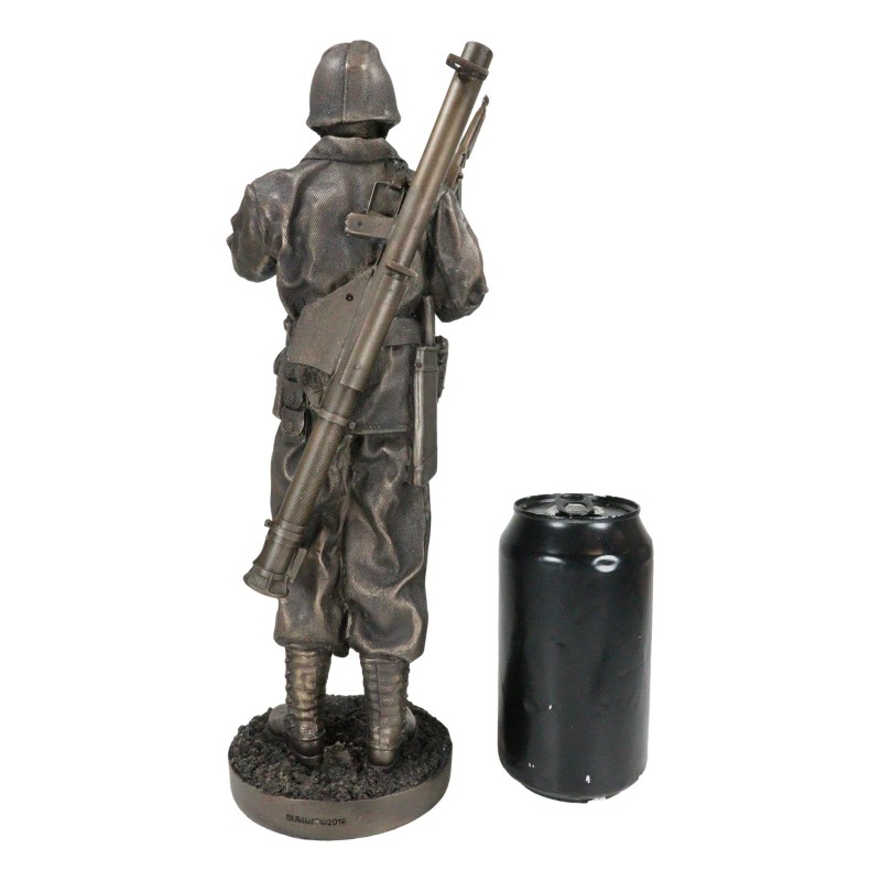 • This figurine is a detailed replica of a World War Combat Sergeant at rest in a station. He stands at the commanding post and gazes across the war torn terrain smoking a cigar. He carries a bazooka on his back and a rifle on his right arm.