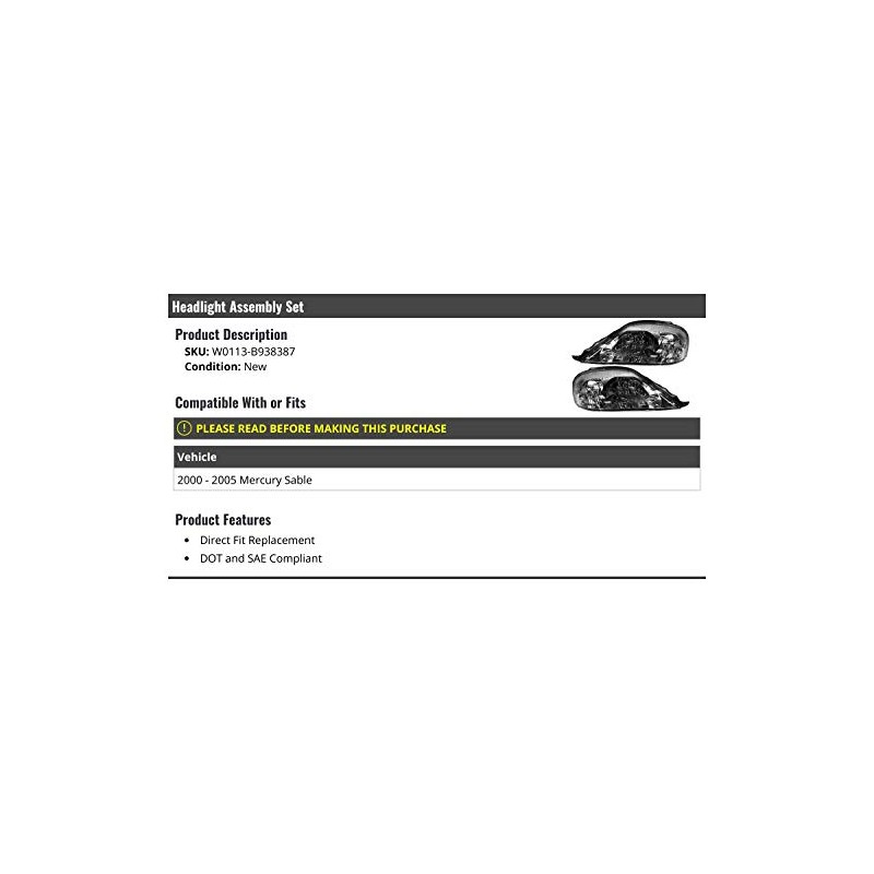 Marketplace Auto Parts Headlight Assembly Set of 2 - Compatible with 2000-2005 Mercury Sable