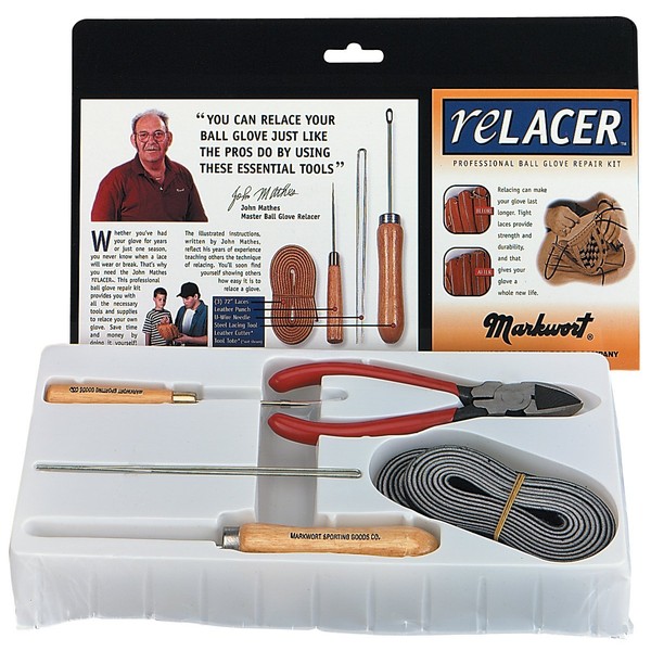 The Markwort Deluxe Professional reLacer Kit is a complete ball glove repair kit containing all the tools and supplies needed to relace ball gloves. In addition to laces, a leather punch, u-wire needle, steel lacing tool, and step-by-step instructions, also included is a tool tote bag & leather cutter.