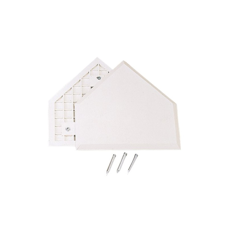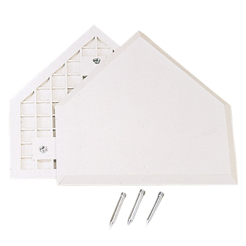 Official softball. Beveled sides for safe, smooth sliding. White surface, finest rubber. With 3 removable metal spikes. WARNING: sliding into a base represents a clear and present hazard. Injury may result.