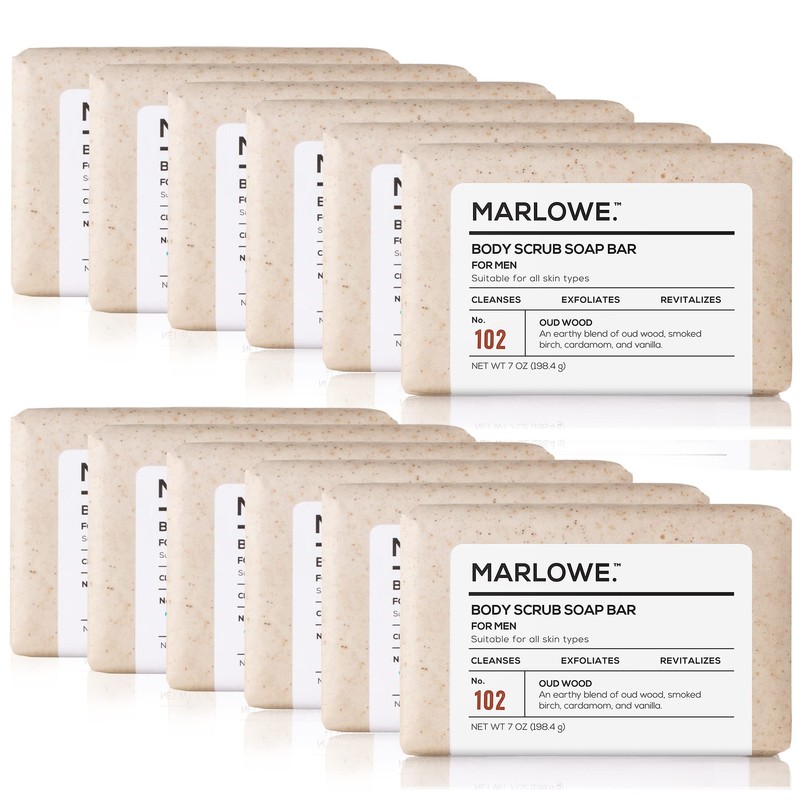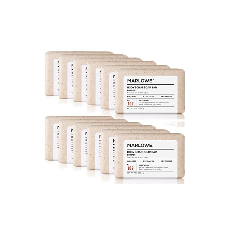 MARLOWE. No. 102 Men's Body Scrub Soap 7 oz (12 bars) | Earthy Oud Wood Scent | Best Exfoliating Bar for Men | Made with Natural Ingredients | Green Tea Extract | Updated Scent (12-Pack)