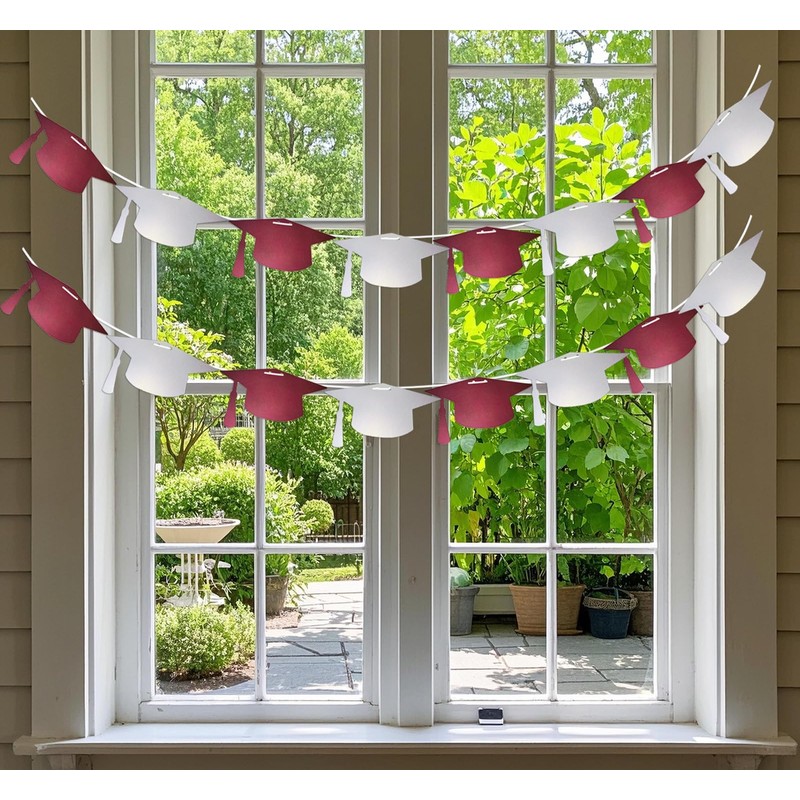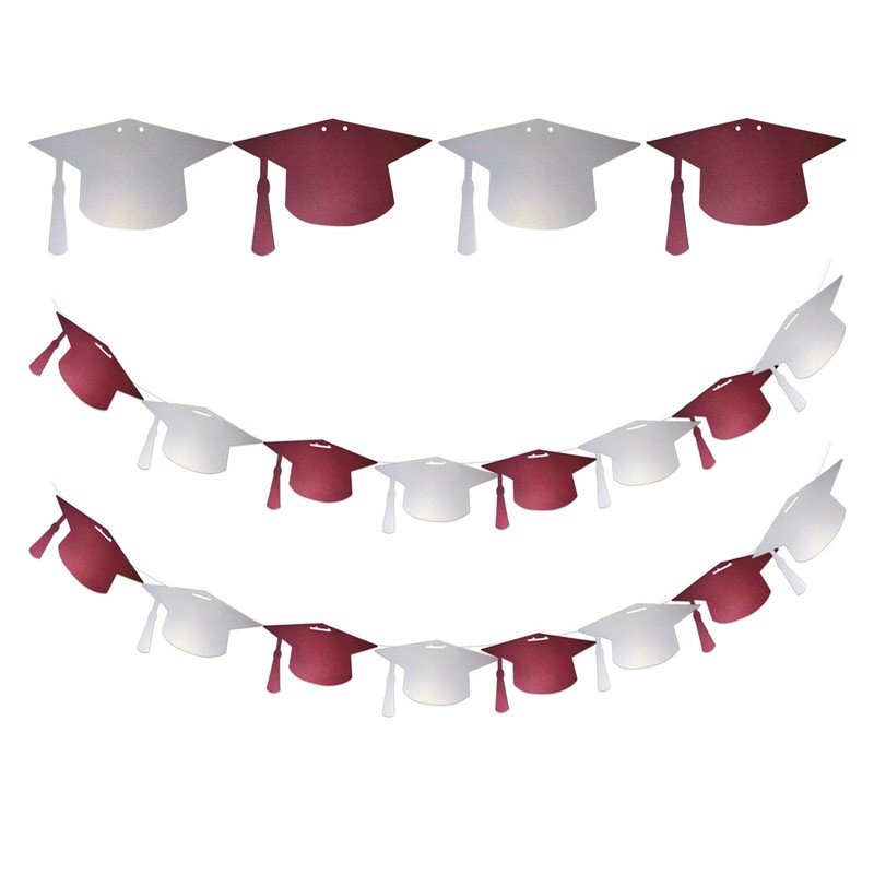 - PACKAGE CONTENTS: Two festive banner strings, each featuring 4 maroon and 4 white graduation caps for a total of 16 decorative pieces