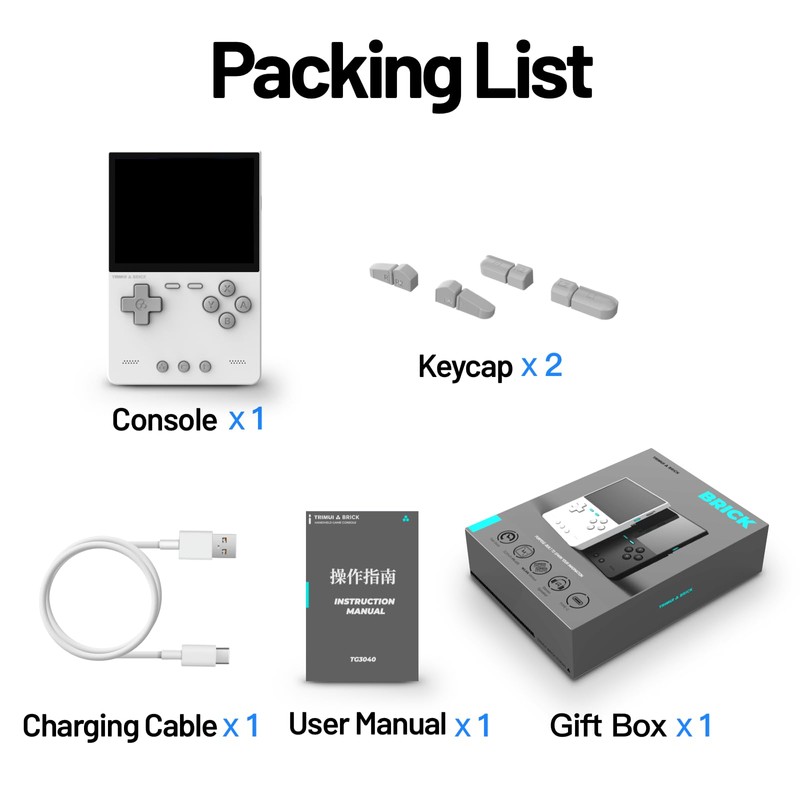 Trimui Brick Console Main Features 3.2-inch IPS full-fit screen: The screen effect is very clear. Provides exciting gaming experience and enhanced eye protection. Cool atmosphere light: atmosphere light on the top of the back, L1/L2/R1/R2 shoulder key atmosphere light, F1/F2 RGB indicator light, adjustable breathing light. Personalized customization: CNC metal back plate, you can freely engrave. Removable shoulder keys, can be freely replaced. Find your exclusive style and create a unique personalized experienceSpecifications Material: Plastic+Glass + Electronic Components Color name: White, Black, Red, Purple System: Linux Display: 3.2 inches, 1024x768 pixels IPS, fully laminated Product dimensions: Width: 73.2 mm, Height: 109.9 mm, Thickness: 19.9 mm, Upper part 11.79 mm. CPU: Allwinner A133P (A133 plus) 1.8GHZ GPU: Imagination PowerVR GE8300 660MHz RAM: 1GB LPDDR4x FALSH: 8GB emmc Audio: Stereo speakers 2 * 1w, 3.5mm headphone jack, mono microphone. Battery: 3000mah, 5 hours of battery life. External TF Card: 64G, 128G, 256G (optional). Charging&USB: USB type-C charging, 5V/1.5A charging, support shutdown charging. 500mA limit under USB data transmission Indicator/Ambience Light: Side power button integrated charging indicator/back top atmosphere light, L1/L2/R1/R2 shoulder button atmosphere light F1/F2 RGB indicator. Function Key: Custom FN lock switch, front F1/F2 shortcut key. Interface: Bottom type-C, USB charging port + OTG function; top type-C, USB host, can be plugged into USB handle. Other Functions: Support double-player battle, single-channel vibration motor. Product Dimensions: 10.99 x 7.32 x 1.18cmWhat's in the box TRIMUI Brick Game Console Type-C Charging Cable User Manual