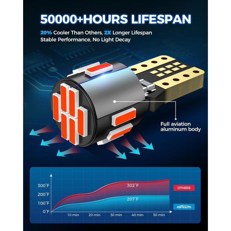 - 【50000+ Hours Long Lifespan】Marsauto advanced cooling technology – maintains 97.5°C LED temperature that 20% lower than others, prevent overheating & light decay. Faster heat dissipation and stable brightness prolong lifespan to 50000+ hours to avoid frequent bulb replacements
