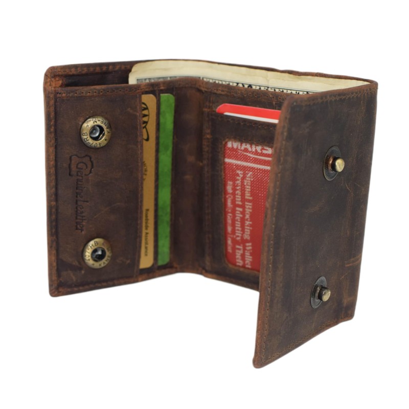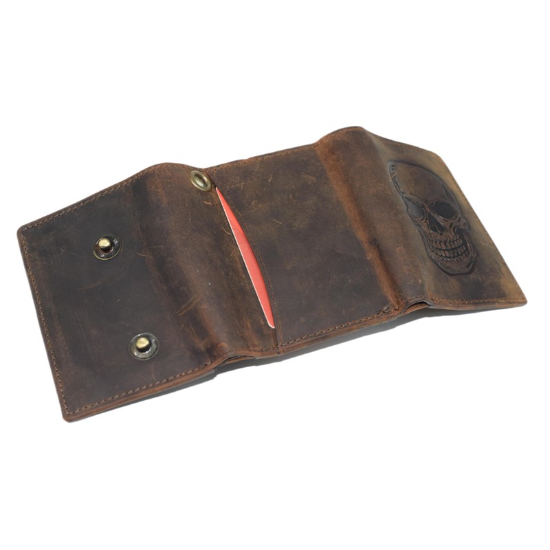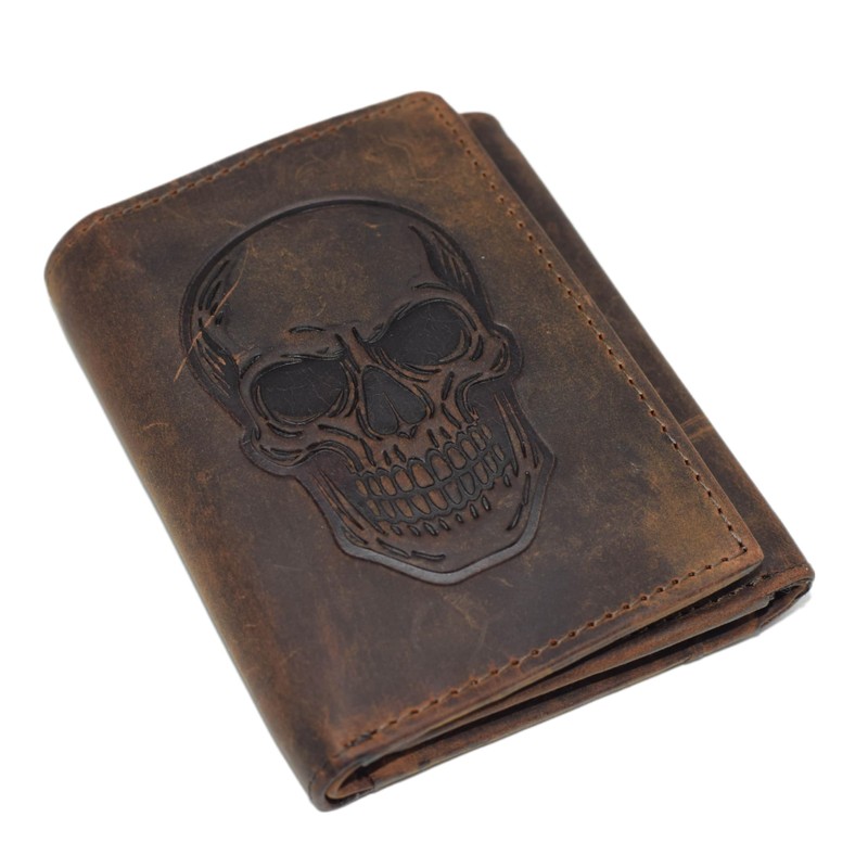 MARSHAL Men’s Genuine Leather Skull Wallet – Trifold RFID Blocking Biker Wallet with ID Window & Snap Closure (Brown No Chain)