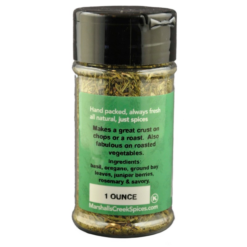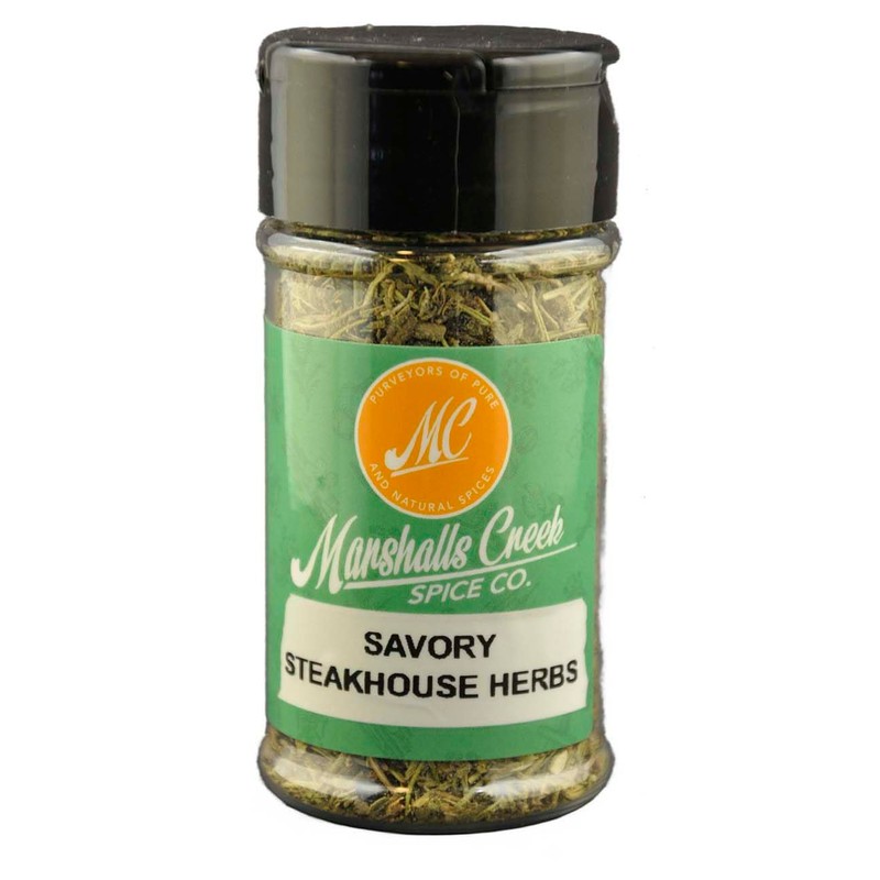 1 ounce jar of Savory Steakhouse Herbs. Ingredients: basil, oregano, ground bay leaves, juniper berries, rosemary, savory.