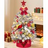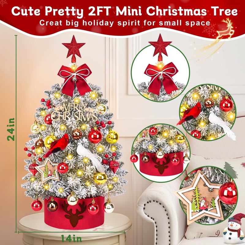MARTINE MALL 2FT Small Christmas Tree with 30 LED Lights, Snowy Flocked Mini Christmas Tree Artificial Tabletop Xmas Trees with Cardinal Birds Red Bow Star Hanging Ornaments for Table Desk Small Space