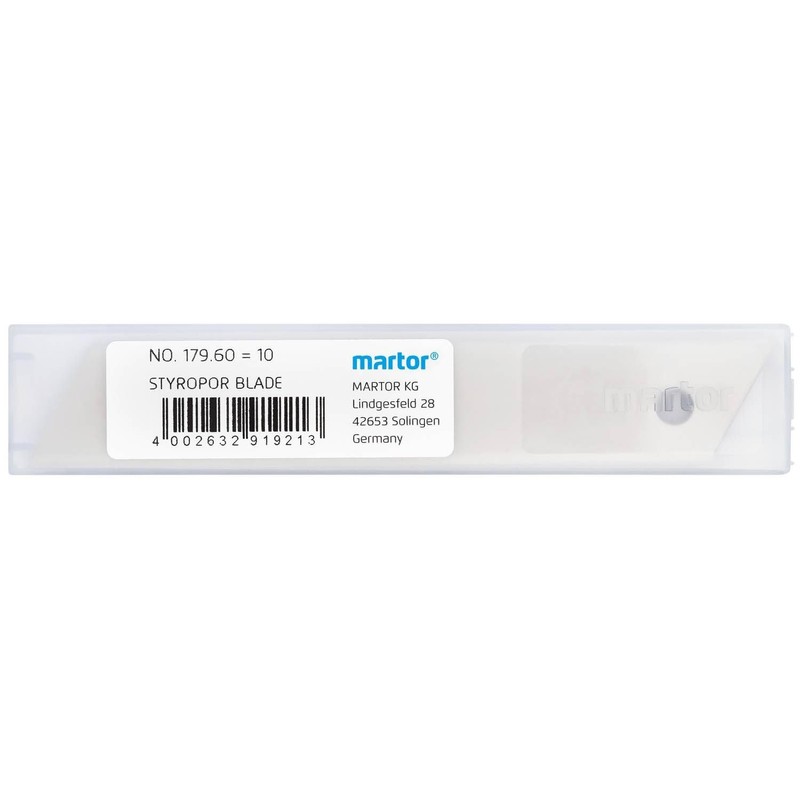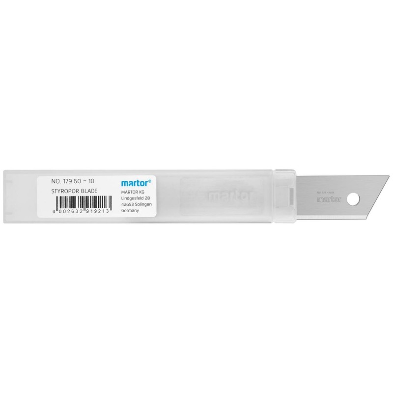 - Box contents and product features: 10 x MARTOR styrofoam blade no. 179 in transparent packaging, material: stainless steel, length: 109.5 mm, width: 17.9 mm, material thickness: 0.5 mm, cut: standard cut, blade facets: 2-fold, 1-hole blade, item no. : 179