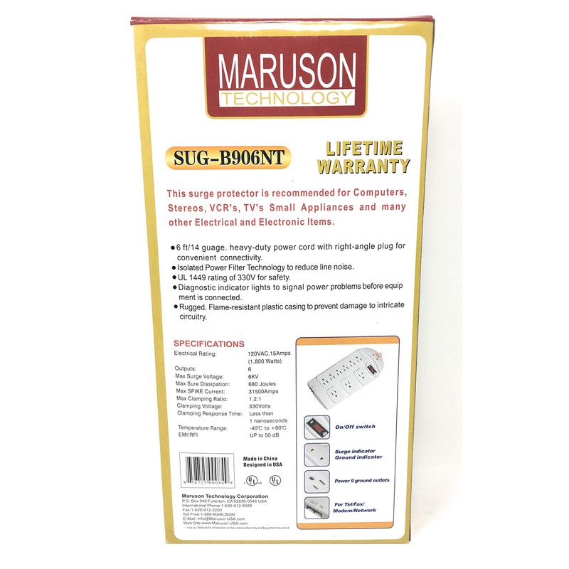 - Outputs: 9; Cable Length: 6 ft; Max Surge Voltage: 6 KV; Max Sure Disspipation: 680 Joules; Max SPIKE; Current: 31500 Amps; Max Clamping Ratio: 1.2:1; Clamping Voltage: 330 Volts; Clamping Response Time: Less than 1 ns