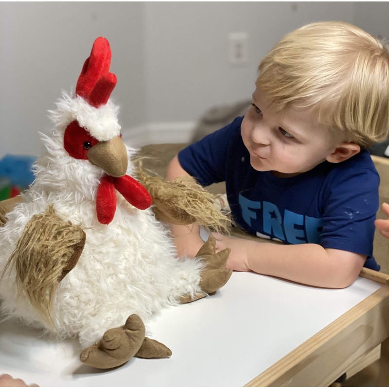 - Rooster is a soft fun friend with a white fabric body and longer brown fabric on its wings and tail
