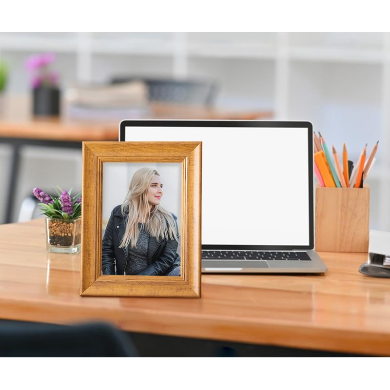 - Frame size: photo frame. Fits 5inch/6inch/7inch/8inch/10inch/A4 pictures, this frame can be displayed on a shelf, bookcase, table or office desk. The suitable tilt angle is perfect for displaying your items on the desk and shelf, show your happy moment and improve the happiness of life.