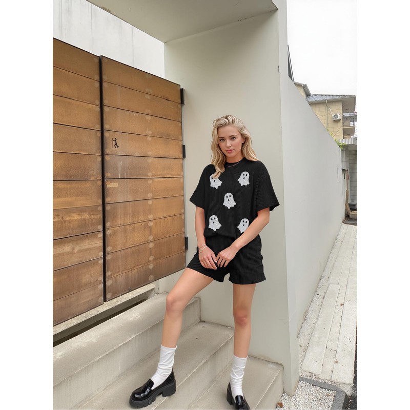MARZXIN Women's 2 Piece Outfits Summer Tracksuit Ribbed Textured Knit Loose Lounge Shorts Set Short Sleeve Matching Sets Black Ghost S