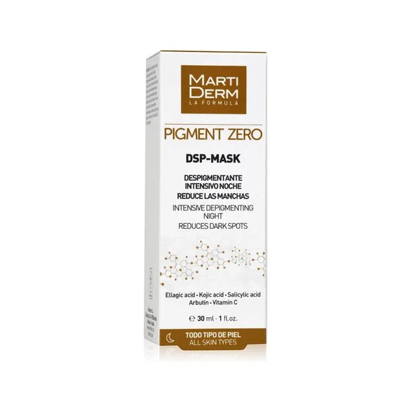 MartiDerm Pigment Zero DSP-Mask es una mascarilla oclusiva de uso intensivo formulada con una elevada concentración de activos, para el tratamiento de las hiperpigmentaciones de cara, cuello, escote, brazos y manos de cualquier origen o naturaleza. Es una mascarilla facial para un cuidado intensivo nocturno con una acción despigmentante más rápida y eficaz. El efecto oclusivo de la mascarilla y la alta concentración de activos despigmentantes permiten obtener más resultados en menos tiempo. DSP-Mask reduce de manera significativa las manchas gracias a su alta concentración de activos, como la arbutina, el ácido kójico y el ácido salicílico. Fácil aplicación para zonas localizadas.