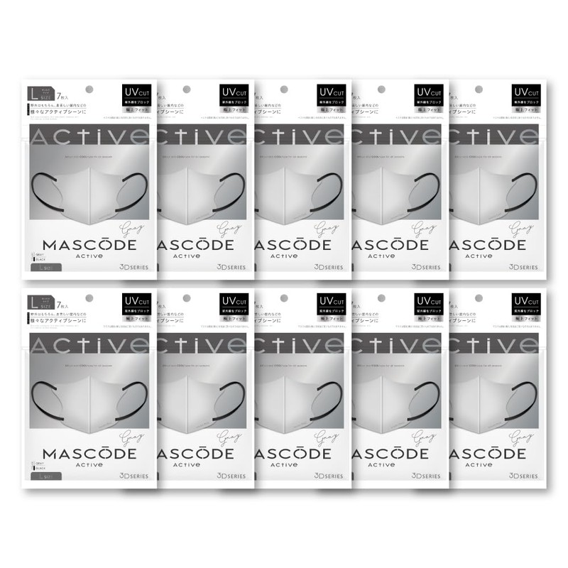 [MASCODE] 【 マスコード ひんやり 冷感 UVカット マスク 不織布 マスク 立体 バイカラーマスク 花粉 クールマスク 3D アクティブシリーズ 10袋セット(1袋7枚入り) (L グレー×ブラック紐)