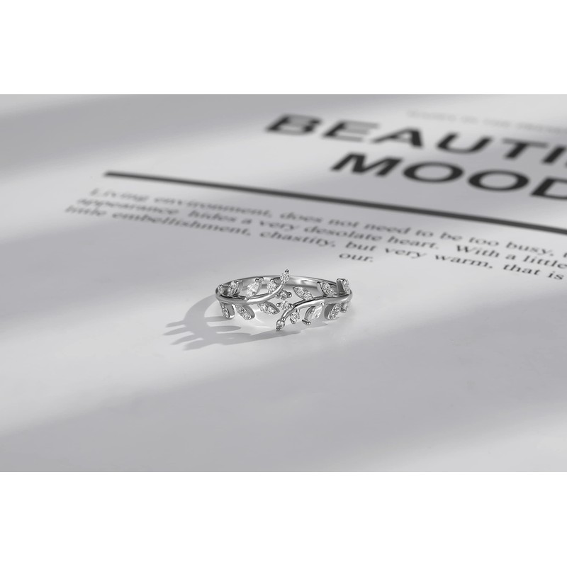 MASOP Ring Sterling Silver 925 Branch Leaf Adjustable Open Rings AAA Cubic Zirconia Jewellery Sterling Silver Gifts for Women Girlfriend Sister Mother, Rhinestone