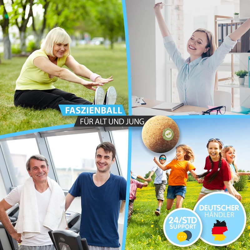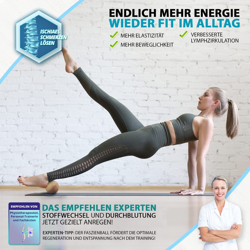 - Faster recovery: by "rolling" with the cork ball, you promote the recovery of the deep muscle zones after training (muscle soreness) and can ensure that you regenerate faster. Treat knotted muscles with trigger point massage.