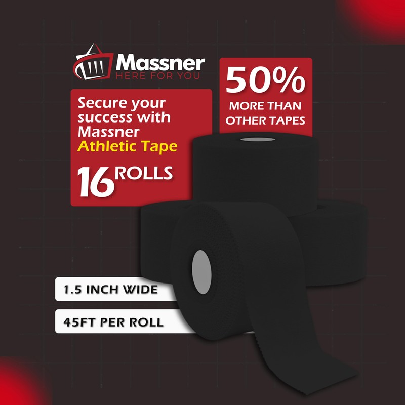 Massner Athletic Tape–16 Black Roll Value Pack –1.5 Inch Wide x 45ft Long – Strong Adhesion, Sweat-Resistant, Easy Tear – Hypoallergenic, Latex-Free Sports Tape for Ankle, Wrist, Football & Recovery