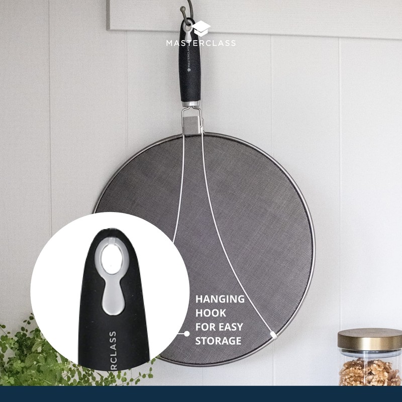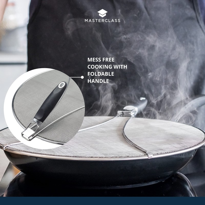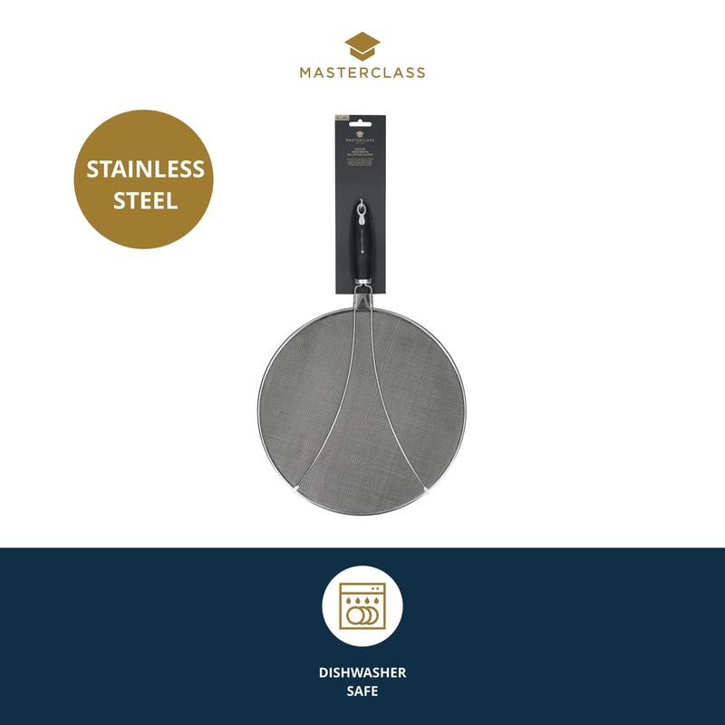 - Durable stainless steel filter stops splatters of hot oil and fat