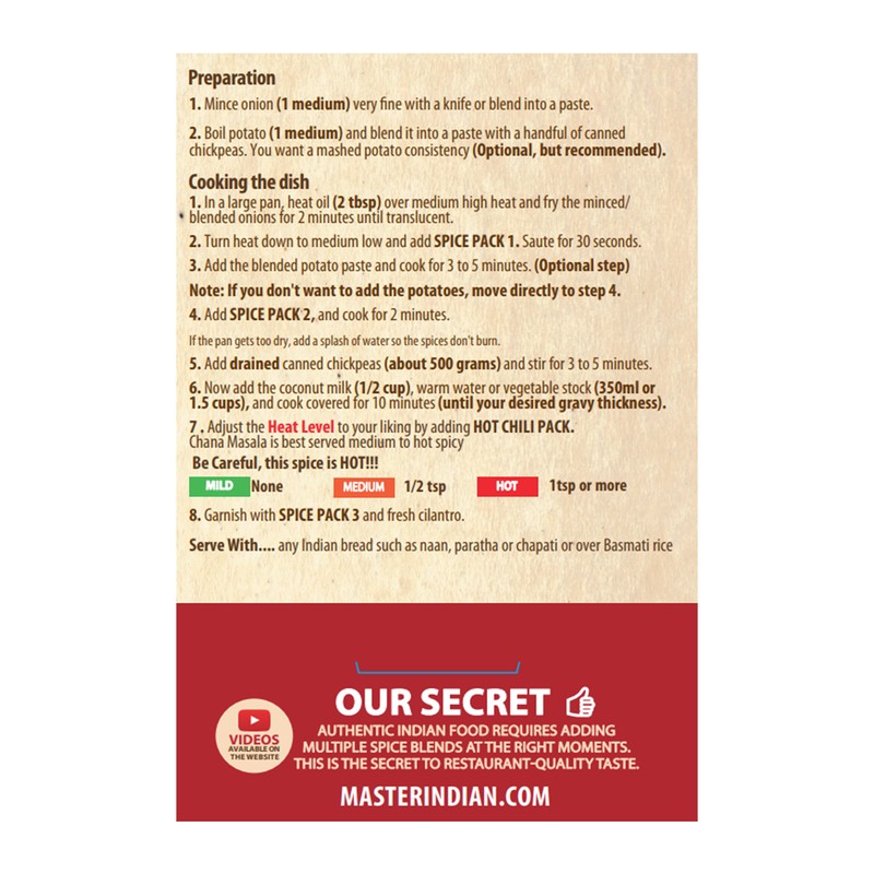 7. Adjust the Heat Level to your liking by adding HOT CHILI PACK. Chana Masala is best served medium to hot spicy