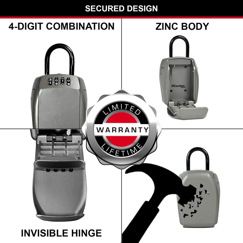 The Master Lock 5414EC Heavy Duty Key Lock Box features a 105mm wide metal body for durability and accepts multiple house keys and access cards. Stop hiding your keys under the doormat or under a flower pot. The portable design offers removable installation. Set-Your-Own 4-digit combination for keyless convenience and increased security. The protective cover protects combination dials from weather, dirt and grime. The Limited Lifetime Warranty provides peace of mind from a brand you know and can trust.