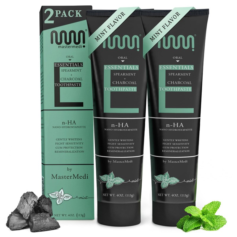 MasterMedi Fluoride Free Nano Hydroxyapatite Toothpaste – Spearmint + Charcoal Flavor – Helps Remineralize, Soothe Sensitive Teeth, Antiplaque, Whitening, SLS Free, Dentist Recommended Pack of 2