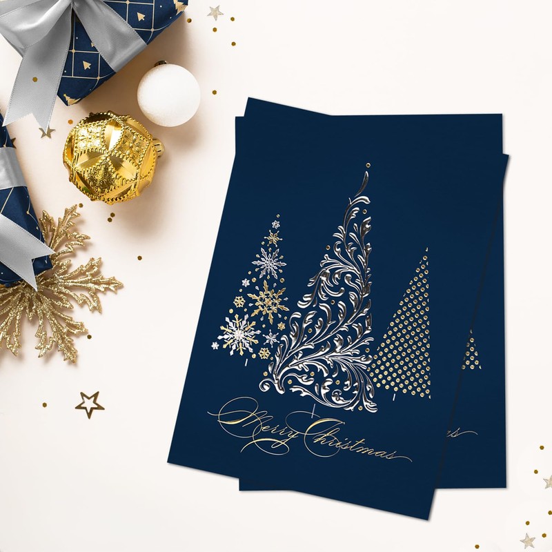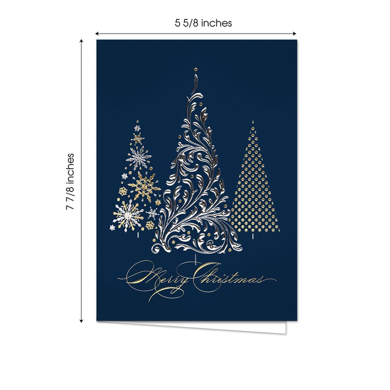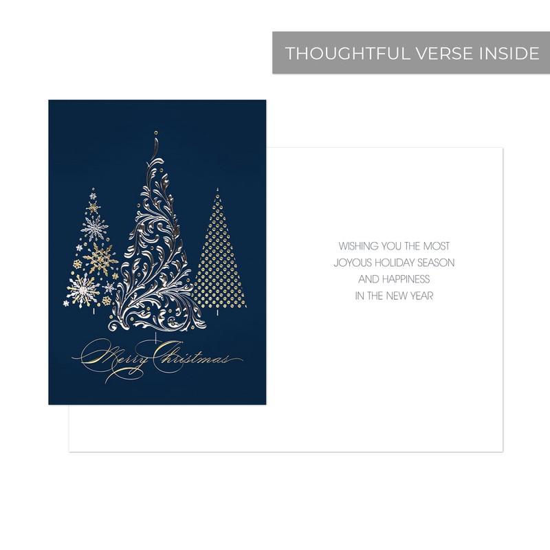 - Design: This classic Christmas card features "Merry Christmas" and traditional holiday tree illustrations with gold and silver foil accents. This charming note card includes "Wishing you the most joyous holiday season and happiness in the new year" sentiment on the inside with space to write your own meaningful message.