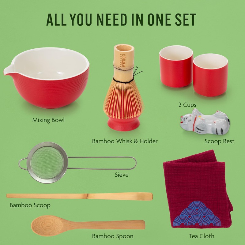 Matcha Tea Set – Japanese Matcha Kit with Bamboo Whisk, Sieve, Scoop, Cups & Ceramic Bowl – Symbolic Red Matcha Ceremonial Set – Authentic Gift Set & Accessories for Smooth, Frothy Tea