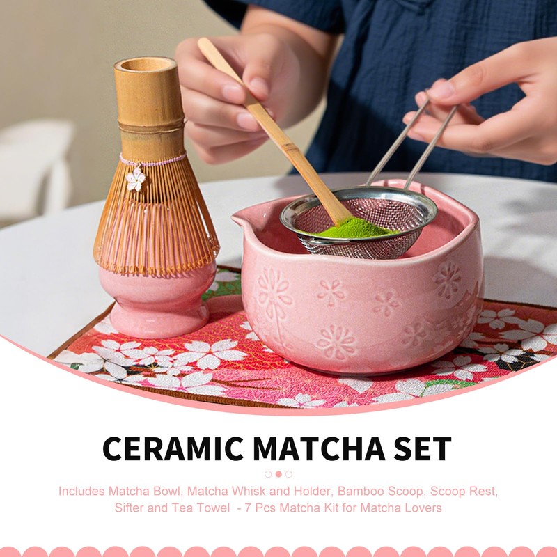 - 7 Pcs Matcha Kit: This matcha set includes essentials for an authentic matcha experience: 1* Bamboo Matcha Whisk, 1* Bamboo Scoop, 1* Scoop Rest, 1* Stainless steel sifter, 1* 530 ml/18 oz Ceramic Matcha Bowl (Chawan), 1* Whisk Holder, 1* Cherry blossoms Tea Towel. Each tool is crafted with precision, designed to make your matcha lifestyle effortlessly stylish.