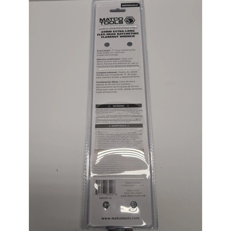 The Matco Tools 24mm Extra-Long Flex-Head Ratcheting Flarenut Wrench RRFM24XLC is a high-quality hand tool designed for automotive use. Known for their durability and reliability, Matco Tools offers a lifetime warranty on this combination ratchet wrench. With a single 24mm size and the manufacturer part number RRFM24XLC, this set includes a single item that is perfect for professionals and automotive enthusiasts alike. The extra-long flex-head design allows for better access and maneuverability in tight spaces, making it a valuable addition to any tool collection.