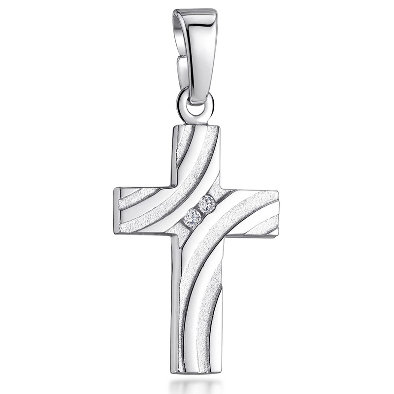 Our cross pendant impresses with its highly polished and matte wave look. Two white princess cut cubic zirconia give this piece of jewellery a subtle sparkle. Whether for women or girls, this small cross can be worn by almost any age. For business look or in everyday life, as a gift idea for christening, communion or confirmation. This cross pendant is a special, timeless jewellery for every day.