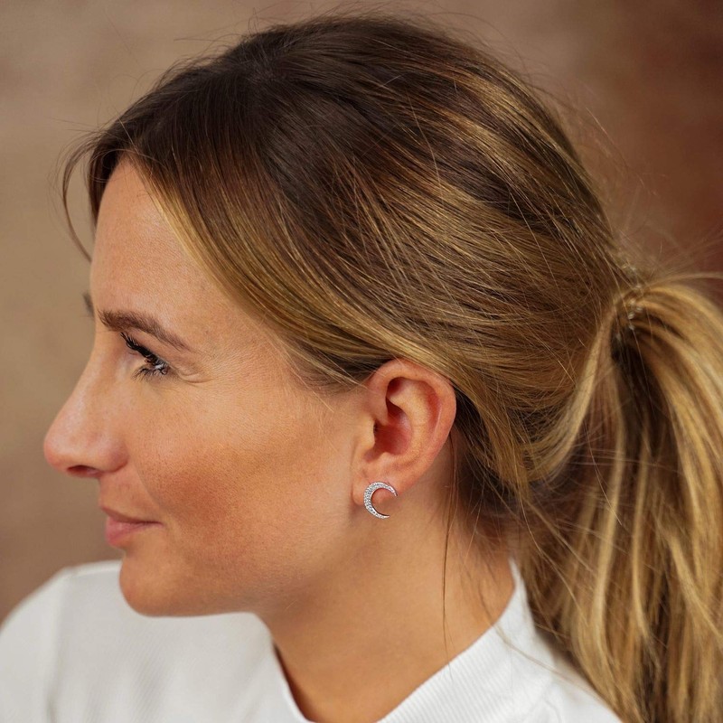 - Always carry the power of the moon on you. The crescent moon stud earrings shine with numerous white zirconia stones and are made from the finest 925 sterling silver.