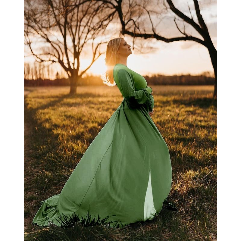 Maternity Gowns for Photoshoot Long Bishop Sleeves Baby Shower Dress Pregnancy Summer Wrap Split Sweetheart Maxi Photography 2025(Green M)