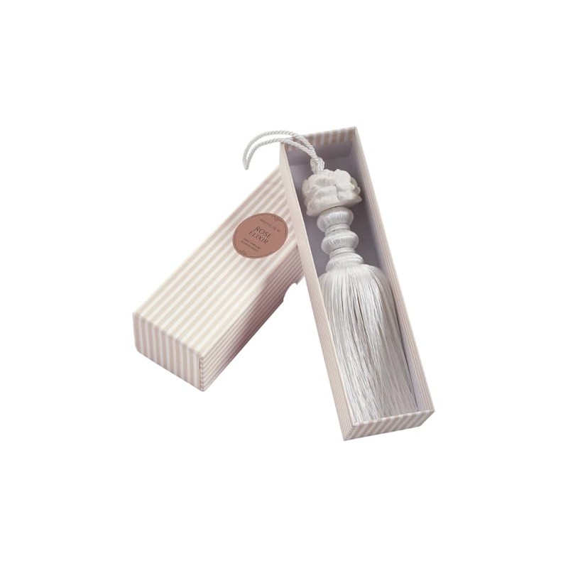 Inspired by the finest trims, this magnificent floral royale pompom with a decor of fragrant plaster that is minimally hand-crafted spreads its sweet scent wherever it is hung, on door handles, drawers or cupboards.