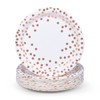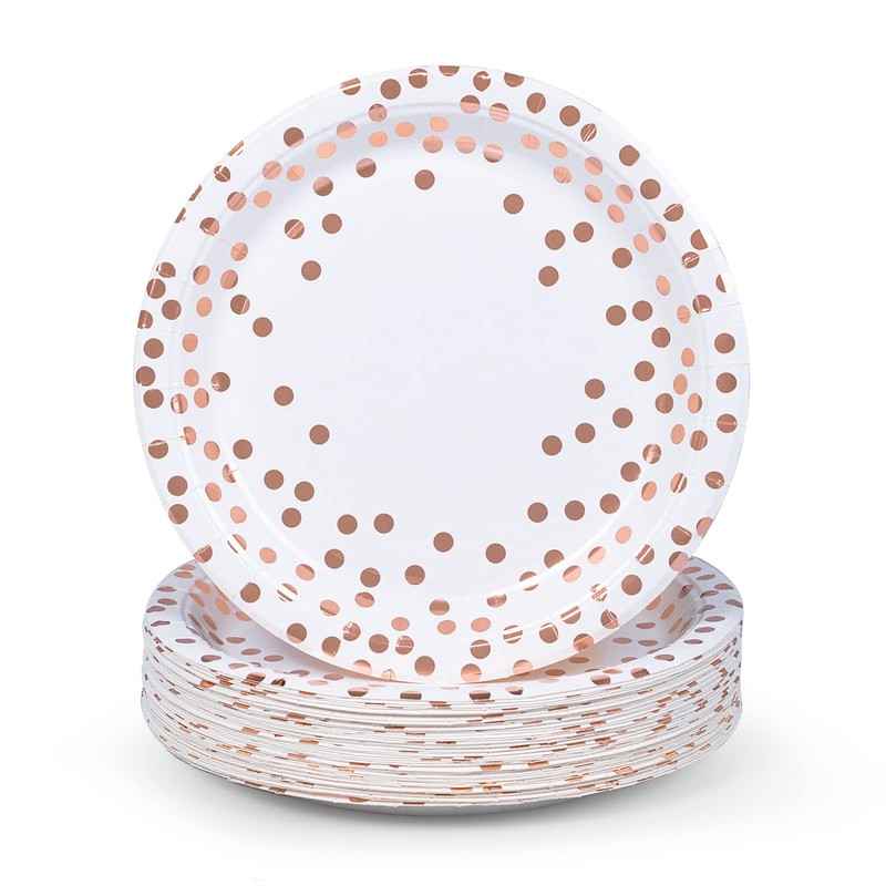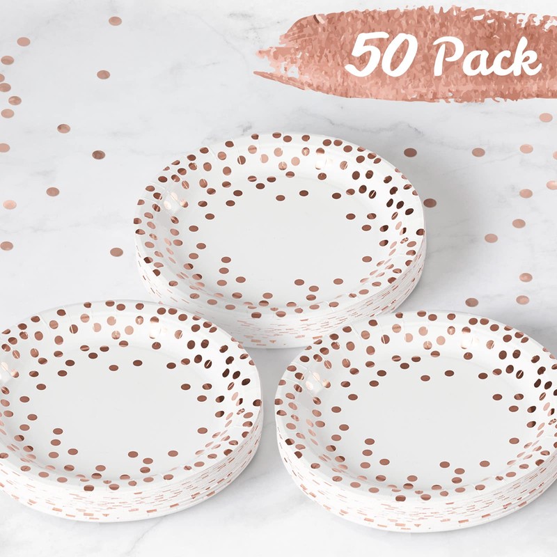 MATICAN Party Paper Plates, 50-Pack Disposable White and Rose Gold Plates, Foil Polka Dots, 9-Inch