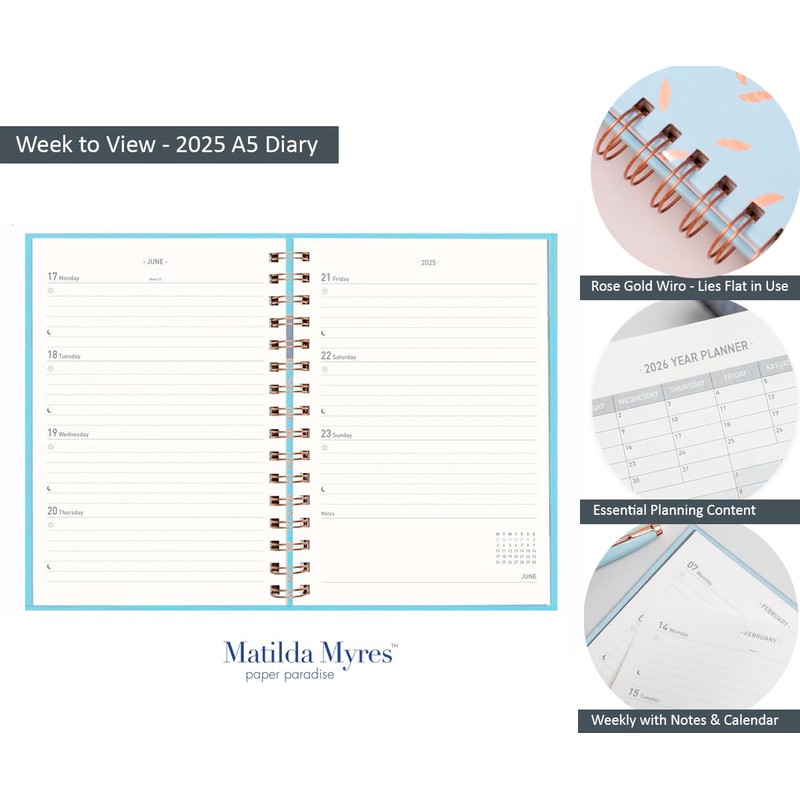 Matilda Myres Terminplaner 2025, A5, Wochenansicht, roségoldener Spiralbindung, Januar bis Dezember, fester Einband, Blau