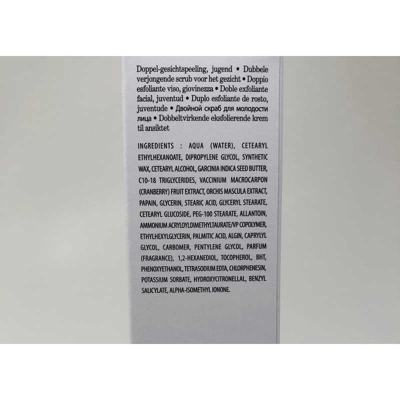 • The dual exfoliating action, mechanical and enzymatic, allows to refine the skin Grain and to accelerate the cell renewal