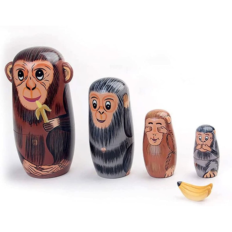 - Set of 4 colourful matrioskes + wooden bananas with monkey family.