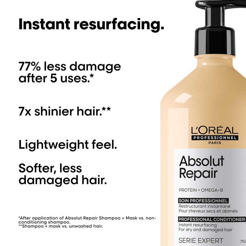 - Absolut Repair Collection: When used as a complete regimen of shampoo conditioner or mask transform dry damaged hair to achieve up to 7x shinier hair and 77% less surface damage. *