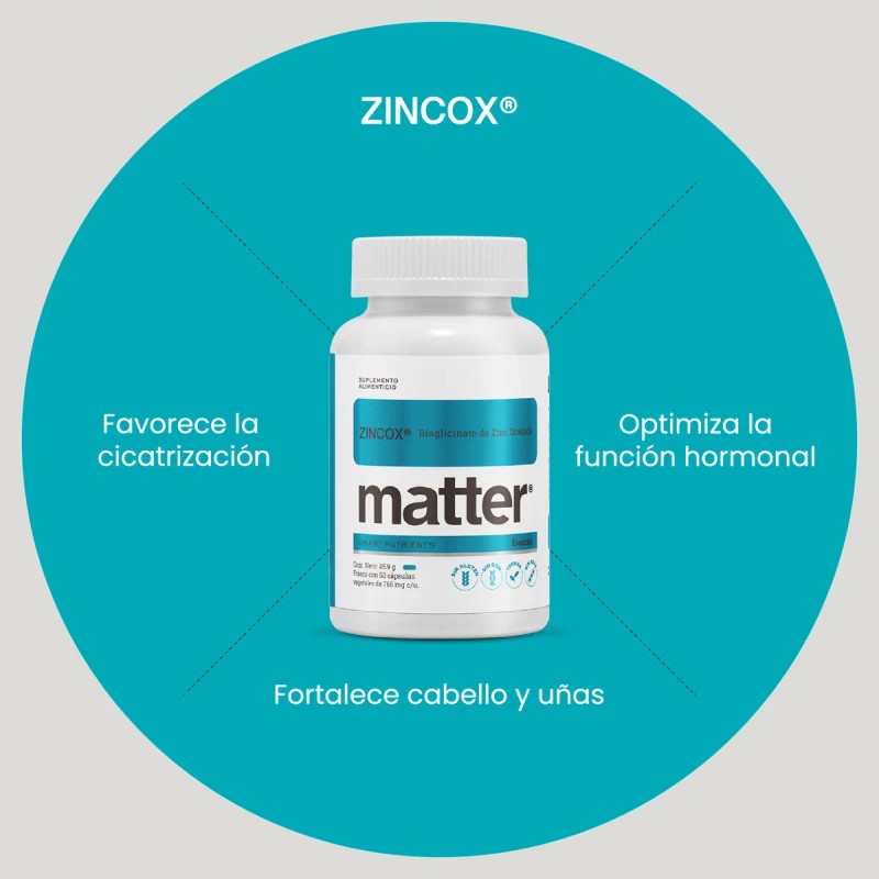 MATTER S - Zincox Suplemento de Bisglicinato de Zinc Quelado, Alta Absorción, Sin Azúcar, Sin Gluten, Sin OGMs, Vegano - 60 Cápsulas