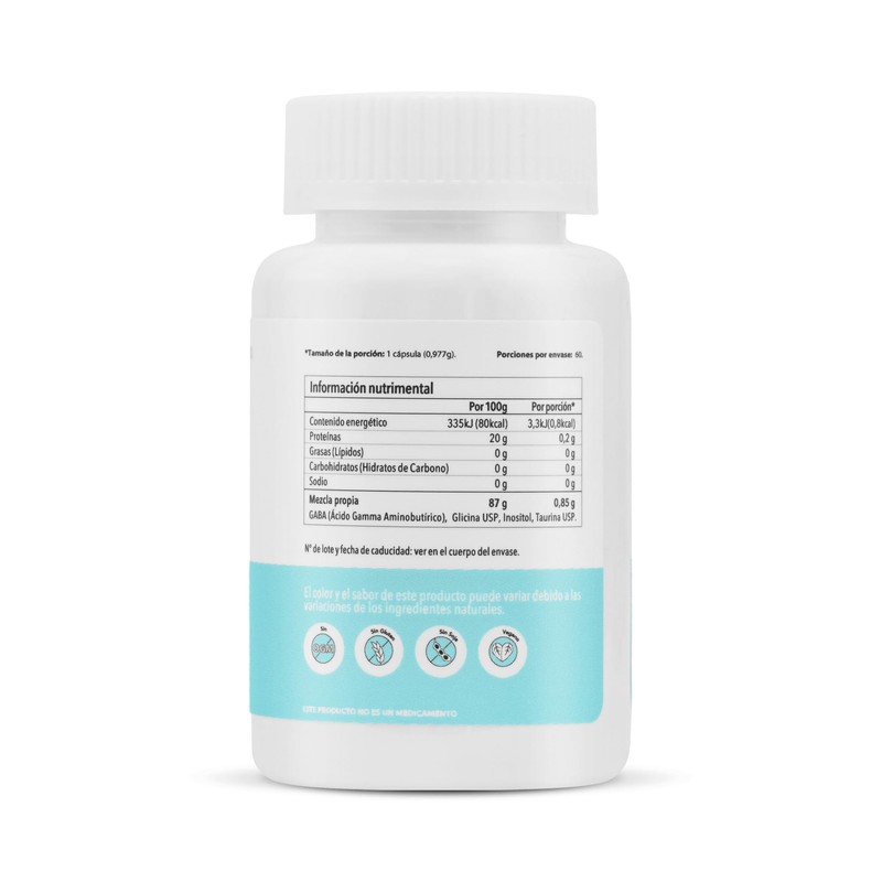 - Contenido: Inositol, Cápsula Vegetal (Hidroxipropilmetil-celulosa), GABA (Ácido Gamma Aminobutírico), Glicina USP, Taurina USP & Sílice.