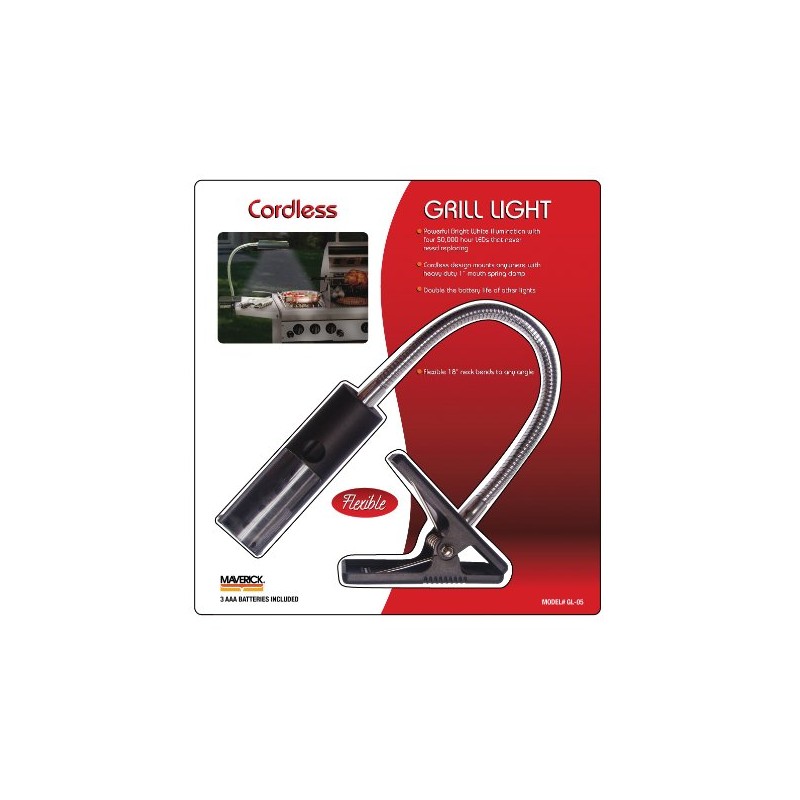 This handy portable grill light by Maverick is the perfect companion for those barbeques that stretch late into the evenings. This grill light conveniently clips to any grill and features a bendable gooseneck arm so light can be directed at any angle you need. It features 4 brilliant LED bulbs, which last 50,000 hours. The energy efficient design yields double the battery life of other lights. You can expect 4-6 hours of continuous light each night, throughout a whole summer with intermittent on/off operation on just three AAA batteries. And the Maverick Grill light is perfect for all those places a little extra light is desired-you'll be sure to find many places where this handy gadget can help you "shed a little light" on things.