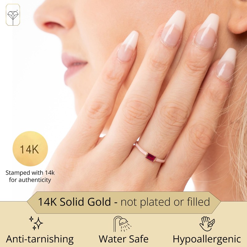 - RUBY STATEMENT RING: Adorned with a striking 5x3mm created ruby, this ruby birthstone ring is a tribute to bold beauty and impeccable craftsmanship.