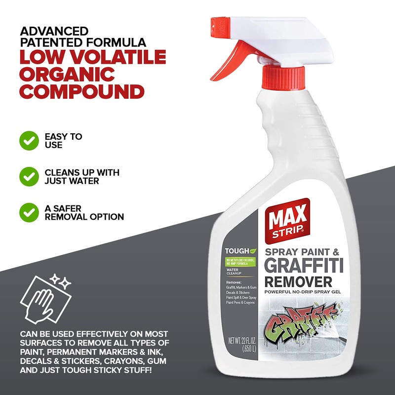 - FAST ACTING SPRAY GEL STRIPPER - Does the work of several products in one removing Graffiti, Markers and Gum, Decals and Stickers, Paint Spills and Over Spray, Paint Pens, Crayons and More!