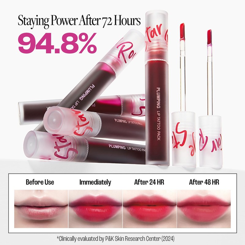- 72-HOUR WEAR, 5 VIBRANT COLORS. Ready for lips that slay all day? Rouge Star Lip Plumping Tattoo has you covered! Enjoy vivid, highly pigmented colors that stay vibrant for up to 72 hours. Choose from Classic Red, Plum Berry, Pop Pink, Richly Red, or Spicy Orange, peel off the mask to reveal your favorite color and go touch-up free!