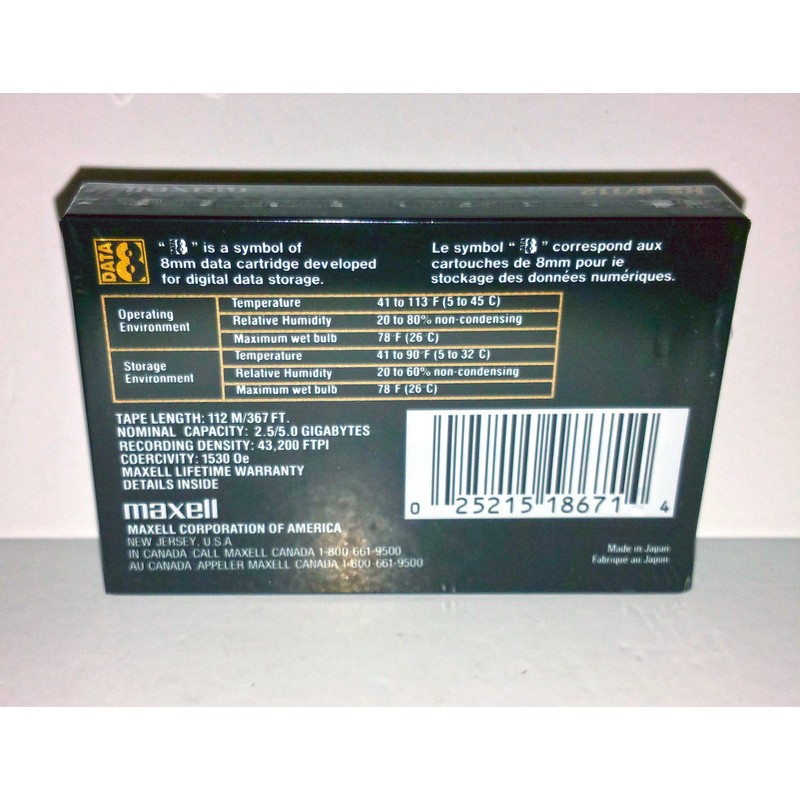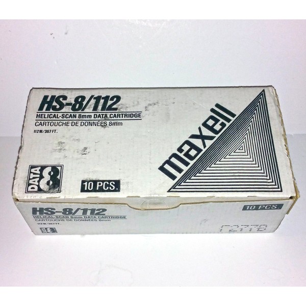 Box of Ten (10) Maxell HS-8/112 DAT Data Cartridge Tapes. FROM MANUFACTURER: Maxell's HS-8/112 8mm Data Cartridge has a capacity of 2.5 GB without compression, 5.0 GB with compression, and a tape length of 112 meters. Maxell has developed these cartridges especially for high-capacity data storage and library applications. A patented ceramic coating process is used which acts as a protective armor against heat, humidity, and eventual oxidation. As a result, the tape can withstand up to 2,000 passes and has an archival life of 30 years. Maxell Corporation of America is a full-line manufacturer of digital and analog media products. Maxell's data storage group provides one of the industry's broadest lines of premium digital recording media, including DLTtape, Super DLTtape, LTO and DDS data cartridges, and is a full line supplier of recordable DVD media, including DVD-R/RW, DVD+R/RW, DVD-RAM, as well as CD-R/RW media. All Maxell data storage products are backed by a limited lifetime warranty, money-back satisfaction guarantee, and toll-free technical support.