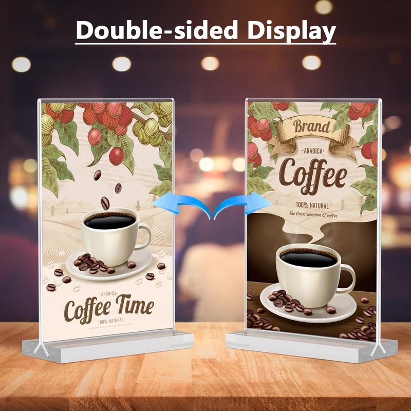 - Double-Sided Display Sign Holder: Clear display stand allows your flyer to be displayed and protected on both sides, unlike slant back sign holder, which only allows you to display on one side. Warm Tips--Please remove the protective film on the acrylic panel and base which designed to prevent scratches on the product before using