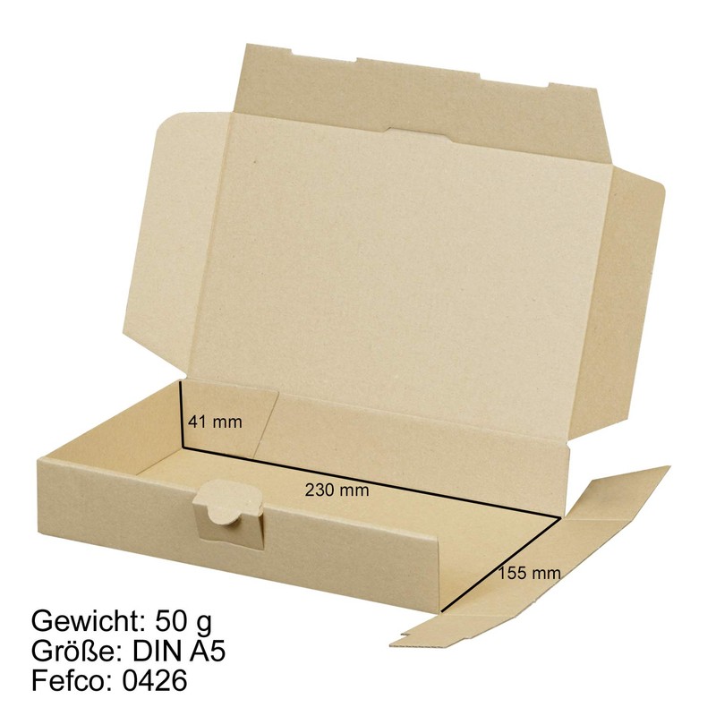 - The box consists of a sturdy E-wave and has the design of the standard Fefco 0426; the box is folded and assembled at the folded edges without the need for adhesive tape, as it is also closed via the insertion flap. The box is up to approx. 2 kg load