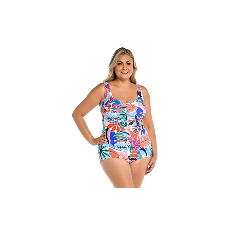 Maxine Of Hollywood Women's Standard Shirred Front Girl Leg One Piece Swimsuit, Multi//Tropical Abstraction, 16