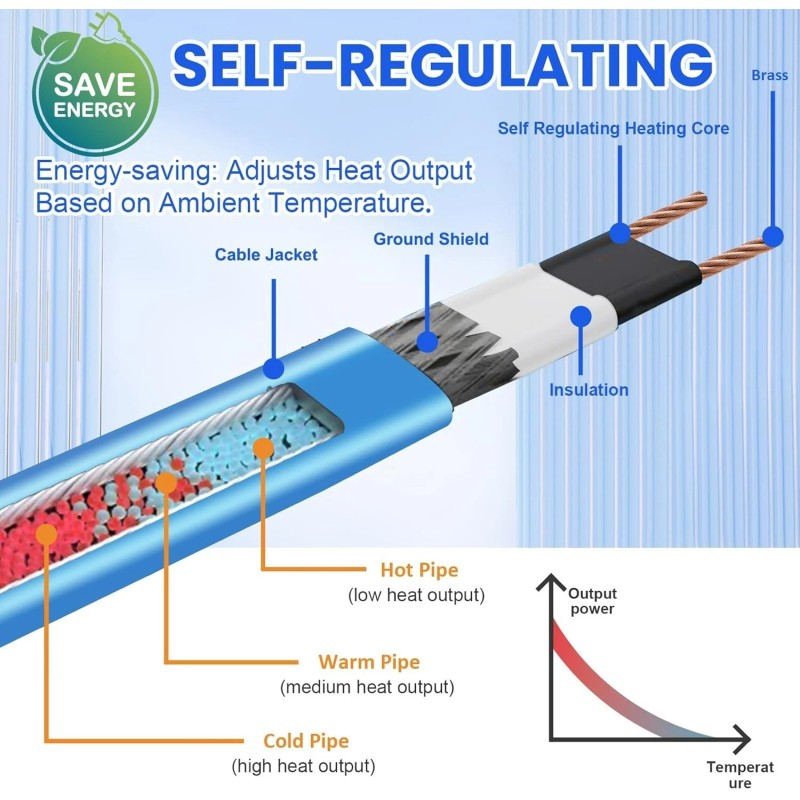 - Smart Heating & Energy Savings: Adaptive heat tape for pipes self-regulates, preventing overheating, and can be applied straight, spiraled, or overlapped. Built-in thermostat of pipe warmer activates at 38°F, saving energy and avoiding the expensive costs.