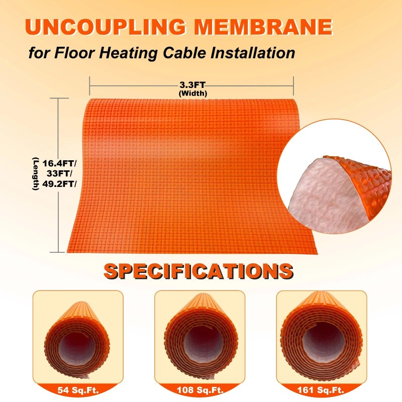 - WORKS WITH ALL FLOOR HEATING CABLES: This heat Uncoupling Membrane Roll works perfectly with all electric floor heating cables found on the market. The cable diameter range is 3.8 - 5.0mm. It's ideal for home renovation use like bathroom, shower floors.